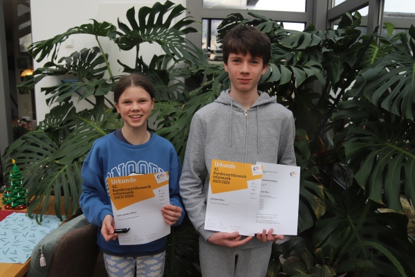 An dem Bundeswettbewerb Informatik haben insgesamt 1711 Schülerinnen und Schüler teilgenommen. Julia Ehlers (Wahlfach Informatik 9d) und Jan Ehlers (Informatik Grundkurs 12) nahmen zum ersten Mal teil und haben bei ihren beiden Aufgaben jeweils 4 von 5 Punkten erreicht! Herzlichen Glückwunsch!